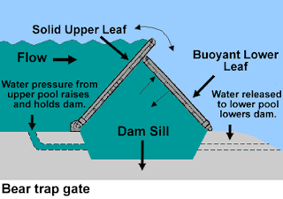The gates of a Bear Trap Dam raise up from the riverbed to increase the level of the upper pool and the flow of water is over the gates. This allows floating debris such as trees and ice to continue flowing downstream. Other gate designs such as