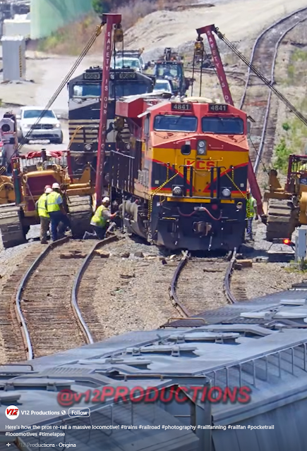[I'm too lazy to research an "Atlas re-railer." I think the end of the video is the same clip repeated a few times. I never did figure out what the excavator was doing. Later I saw the cable was being pulled by a tracked front-end loader instead of another locomotive.]