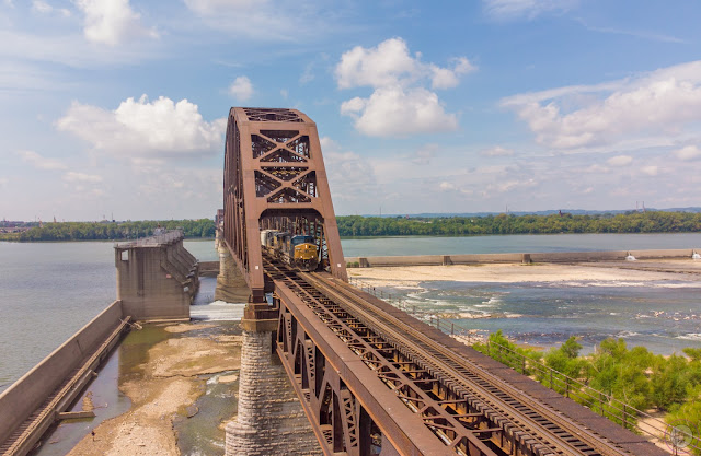 J.B. Rail Photog posted 10/06/2021 - CSX Q688-06 crossing the Ohio River across the 14th Street Bridge northbound with the Louisville skyline towering in the background as this one unit wonder 3194 leading this daily train that goes from the CSX Osborn Yard in Louisville, KY, to the CSX Avon Yard in Indianapolis, IN. Dennis DeBruler: That is also a fantastic view of the control works of the McAlpine Dam.