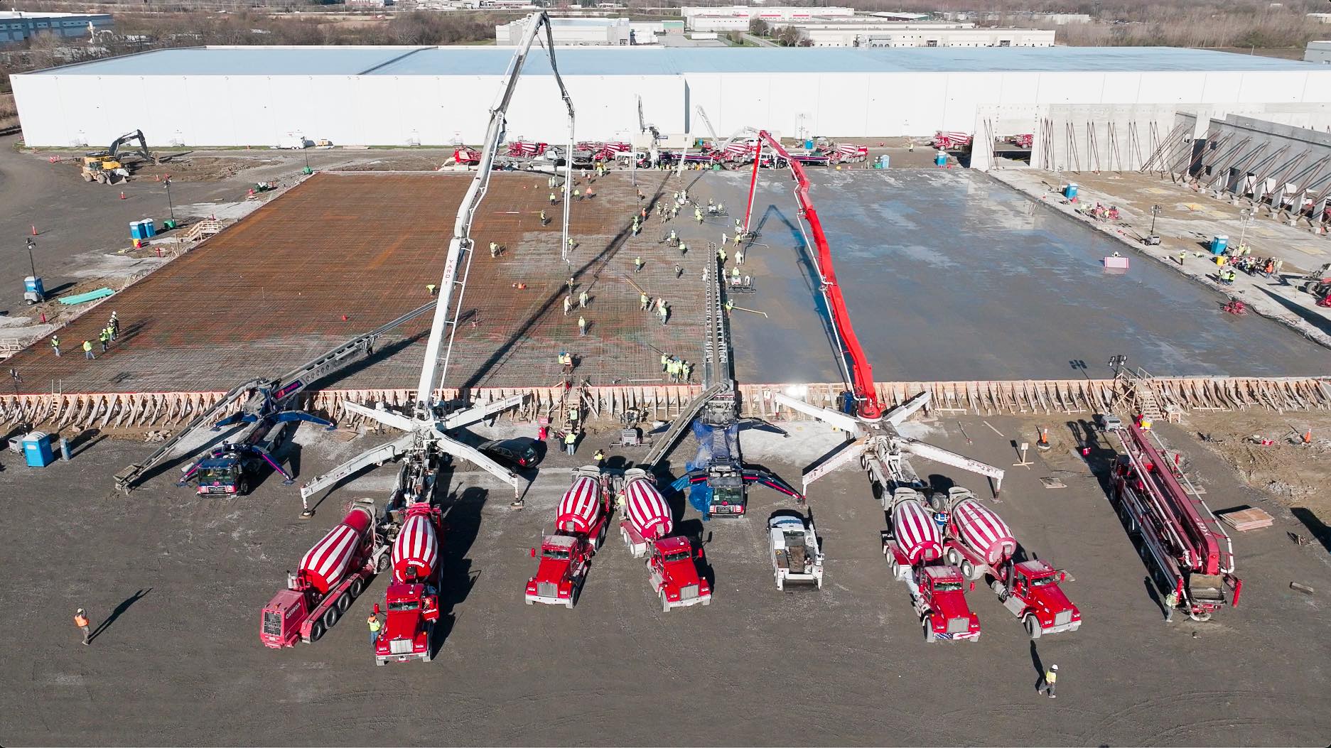 | 1 of 4 phots posted by Ozinga Thank you to the Indiana Ready Mixed Concrete Association for awarding us with the 2024 Outstanding Concrete Project of the Year for our record-breaking Lineage Logistics slab-on-grade project in Hobart, Indiana. Completed in April 2024, this project included Ozinga’s largest single-day slab pour ever, delivering 9,162 cubic yards of concrete for a 130,000-square-foot cold storage building. The effort was supported in partnership with Scurto Cement, Victory Unlimited Construction, and YARD 1, with eight Ozinga plants supplying the concrete. The project utilized our sustainable CarbonSense® mix design, reducing carbon emissions while maintaining exceptional performance. This 12-hour pour was completed without incidents or rejected loads, showcasing the strength of teamwork and precision planning. “This was a true milestone for Ozinga and a testament to the skill and dedication of everyone involved,” said President Justin Ozinga. We’re proud to share this achievement with the IRMCA and our industry partners. Thank you to everyone who made this possible! For more information on the pour, check out our recap video: https://lnkd.in/ggUHiv6C. Tom Rutkowski: I remember that day, I was on the 58 meter. YARD 1. I believe there were eleven plants running. Ozinga nailed the service!!!! Never seen so many concrete trucks in one place at one time! I don't think I ever shut my pump off !!! I am happy to be part of it! YouTube description: "130 ready mix trucks, five concrete pumps, four conveyers, over 9100 cubic yards of concrete delivered and poured in less than 12 hours." [It looks like they have a big concrete pumper parked in the lower-right corner. I presume it is a spare in case there is a breakdown during the pour. I've seen spares in other big pours.] |