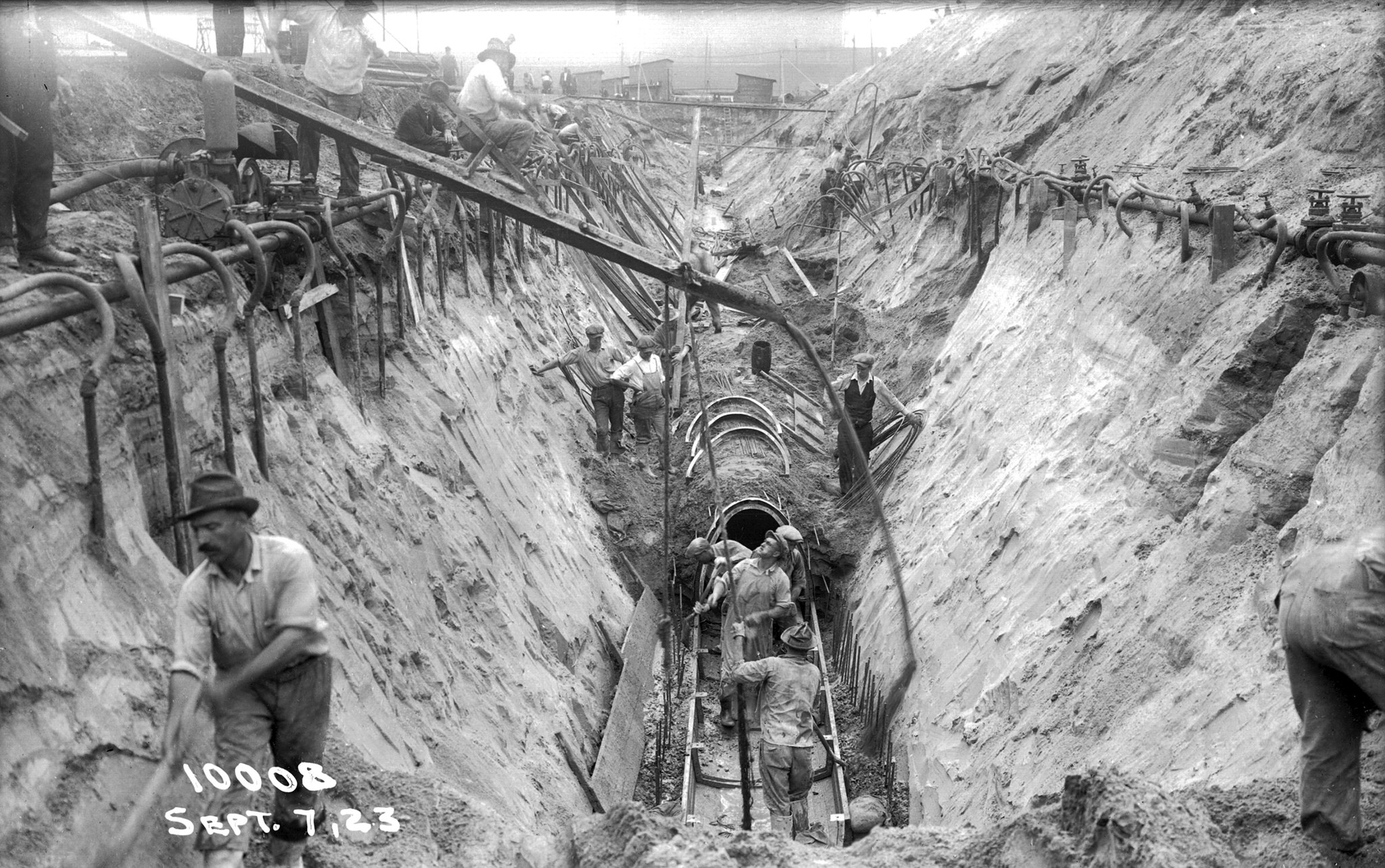 | MWRD posted Construction of a section of the Calumet Intercepting Sewer system on September 7, 1923. |