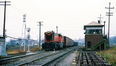 Dennis DeBruler : 'Locks' where the blue colored pipe-connected levers that mechanically insured, thru a plunger at the switch or derail, that the switch or derail points where properly aligned for safe movement thru the switch or derail. In a pinch, a good tower operator would go down to the out of alignment switch/derail, and could use a spike puller as a fulcrum to move the point enough for the plunger to slide in, and then would be able to return to the tower to pull the signal lever. In a completely mechanical interlocking red colored levers were pipe connected. In an electro-mechanical interlocking the red levers activated relays to electrically power the signal. Large terminals and multiple track (3, 4, ,5, 6, etc., tracks sometimes utilized electro-pneumatic pistol grip interlocking. Switches and derails went over with a 'WHOOSH TICK". Sorry , I misspelled 'compensators', devices used to change the pipelines direction and force. Freezing rain wasn't much of a problem, but snow was definitely a pain the rear. Chicago Ridge used the old method, smudge pots to keep the switches and derails clear. Today, at manned/remotely controlled interlocking propane/natural gas burners are used. |