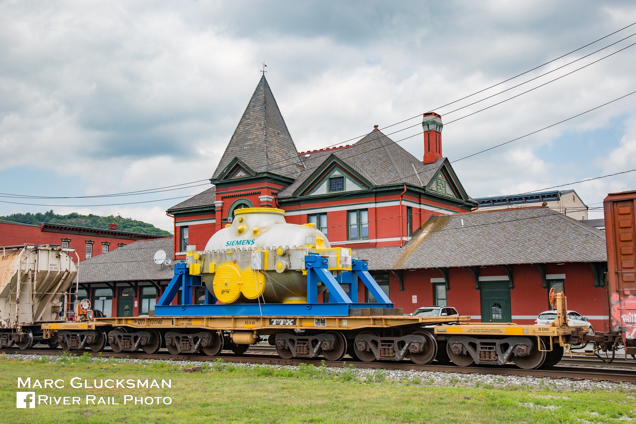 A video of a 16-axle flat car delivering a rebuilt transformer to a weedy spur of a power station with and Alco C425. At 6:40 with just the two buffer covered hoppers, I was surprised how fast and far the train went backwards with a crewman hanging on a ladder as the spotter. It makes you appreciate why they now use old cabooses as spotting platforms. Hanging on a ladder could get tiring rather quickly. Especially if you have to keep one arm free to hold a radio.