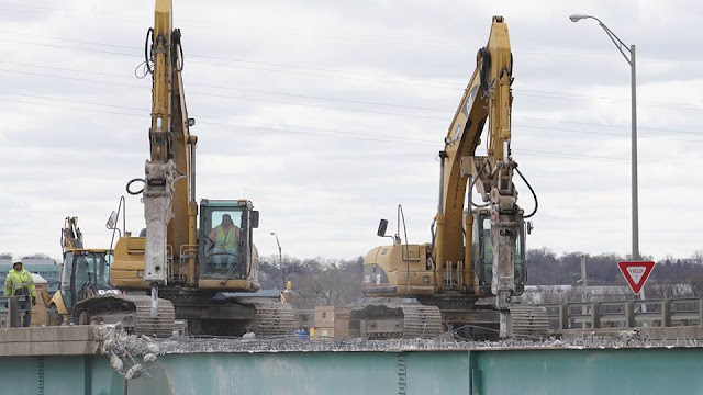 The Iowa-bound bridge construction is on the right and the Illinois-bound bridge construction is on the left.
