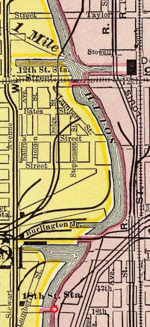 Pete Fileca What railroad is curving to the bottom of the picture Dennis DeBruler Admin Pete Fileca It is a connector from the Chicago & Alton (GM&O) to the RI+NYC. (NYC bought the Lake Shore & Michigan Southern.) C&A shared the embankment with the IC. (Today CN owns both those railroads, but the C&A track has been removed. The embankment still exists because that is how the IC gets from ground level at the 21st Street Crossing to the SCAL, but it is hard to find because both sides of the embankment have been filled in.) That connector forked just after it crossed the Santa Fe to also connect the C&A to the SCAL. Jon's map is accurate enough to drop a pin. First of all, I added a yellow line to highlight the C&A label along the west side of the embankment. Secondly, the photographer was standing just north of the 16th Street Tower (red dot) looking due East. This map also teaches me that this bridge also supported a RI+NYC branch to facilities south of 16th Street. Given the LS&MS label, I presume that NYC was between 16th and 18th and RI was south of RI. The spacing of the tracks reinforces my current theory that these were team tracks. I have to remind myself that this is before the river was moved and the RI had much less land north of here. This map has an error. The C&A connector to the SCAL should not stop at the RI+NYC branch. It should continue on to the SCAL. |