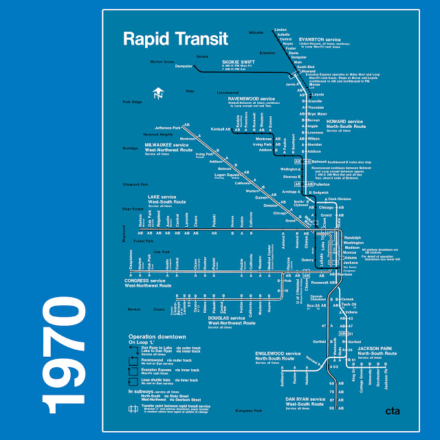This map is after the Dan Ryan Line and the O'Hare extension were built, but before 1993 when the Howard Line was connected to the Dan Ryan Line and the Lake Street Line was connected to the South Side Line.