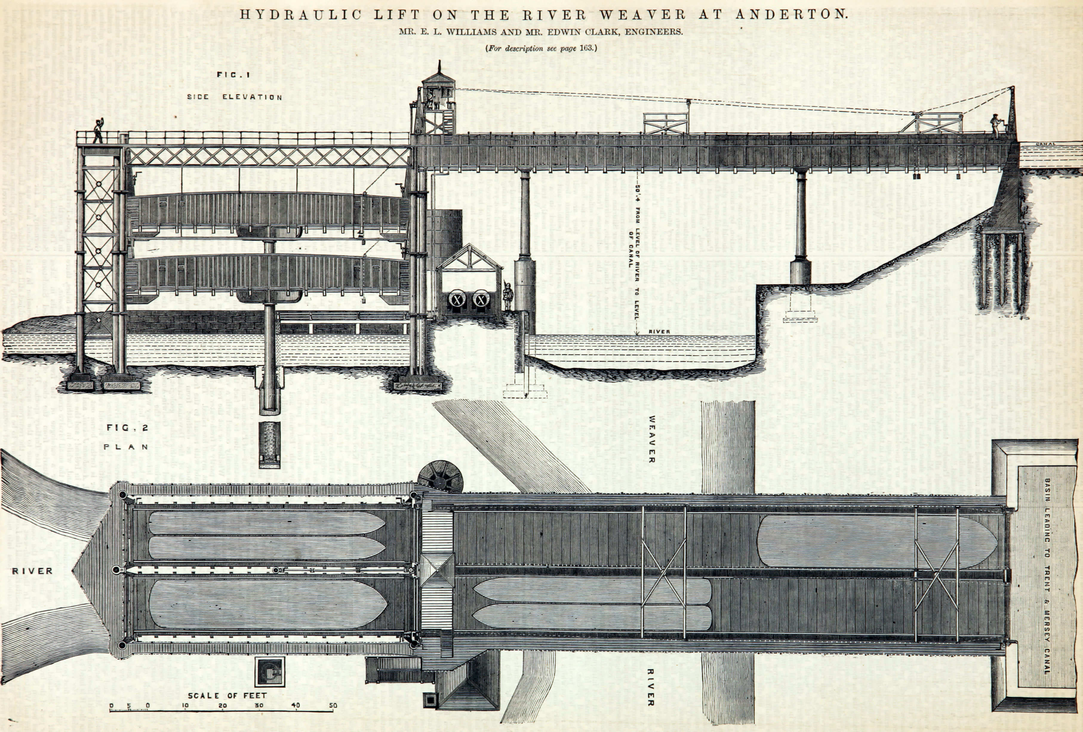 | GracesGuide, this webpage also has a lot of informative details "For balance and minimum power consumption there were two parallel troughs, one rising while the other descended, although the lifts could be operated independently. Each trough had just one central ram, 3 ft [0.9m] diameter. Each ram and its cylinder were assembled by bolting together three sections. The troughs were guided by cast iron blocks at the four corners, moving in guides in the vertical columns. Movement of water from one ram to the other provided 11/12ths of the lift, the final part being provided by a steam driven hydraulic pump via an accumulator. The hydraulic pressure was 550-670 psi." |